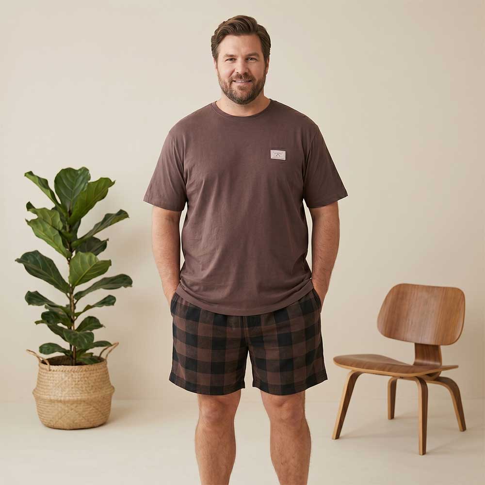 Rjava majica s kratkimi rokavi z okroglim izrezom in diskretno oznako ter kariraste kratke hlače v rjavo-črni kombinaciji z elastičnim pasom, vrvico in žepi.