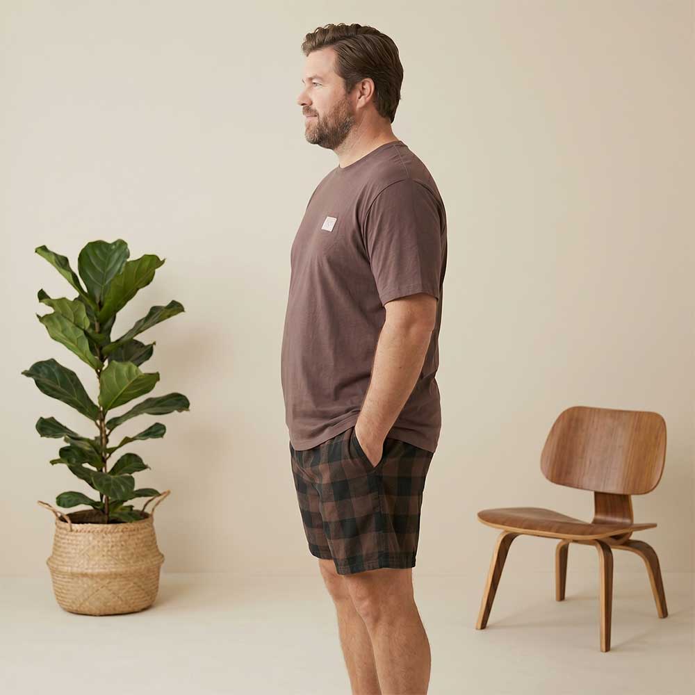 Brez zapletenosti, brez nepotrebnih okraskov. Pižama Borut je moška pižama v najboljšem pomenu besede – funkcionalna, udobna in z značajem. Rjava majica, kariraste hlače in kroj, ki ne moti ne pri spanju ne pri jutranjem kavnem ritualu.