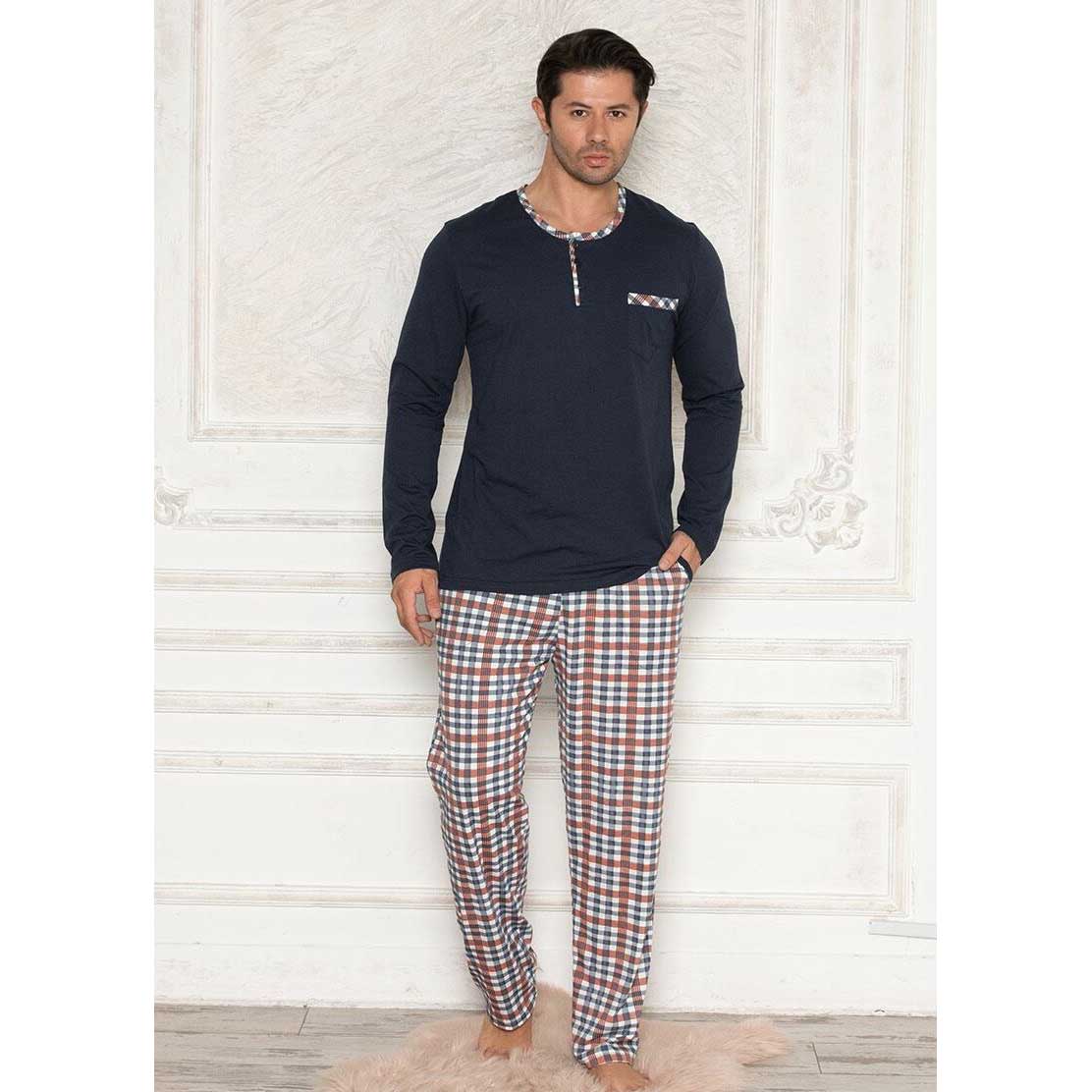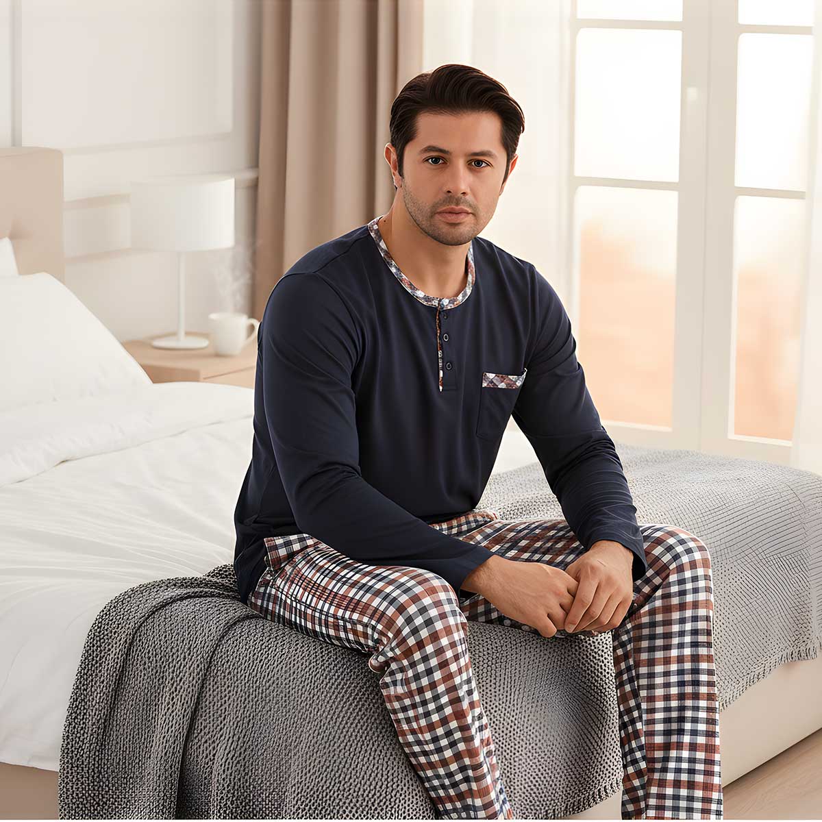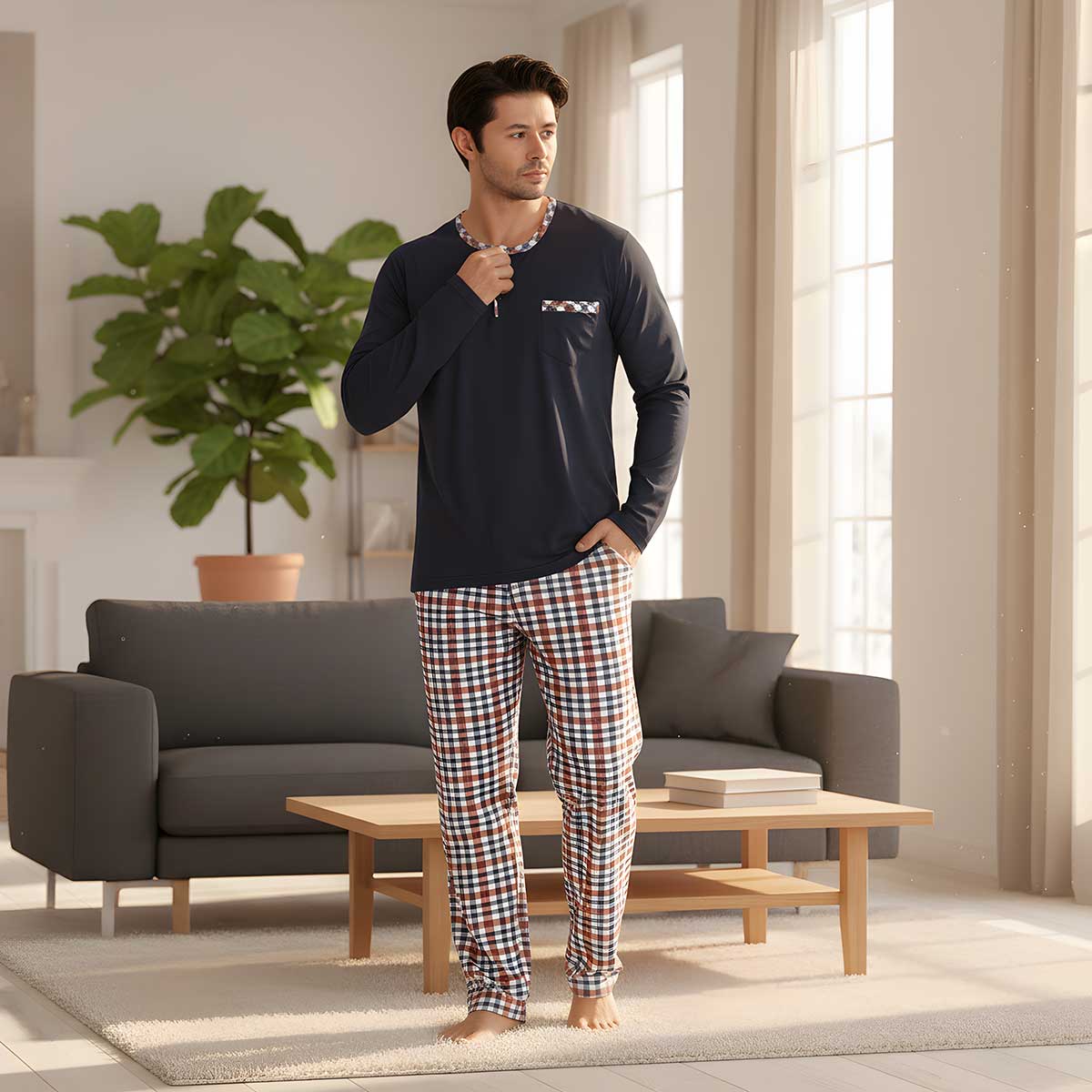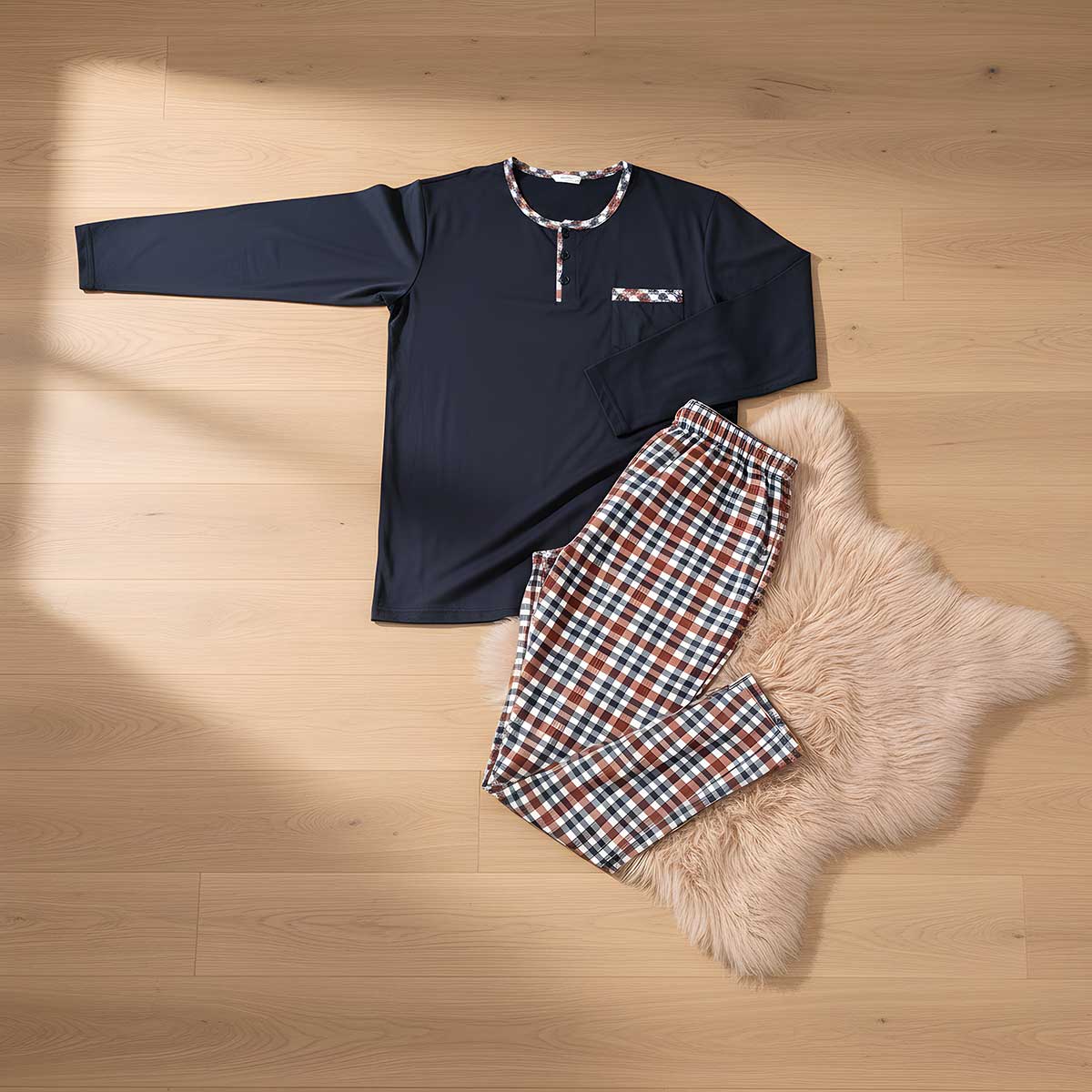 Komplet vsebuje temno modro majico s Henley ovratnikom in stilskim prsnim žepom ter dolge hlače v večbarvnem karirastem vzorcu.
