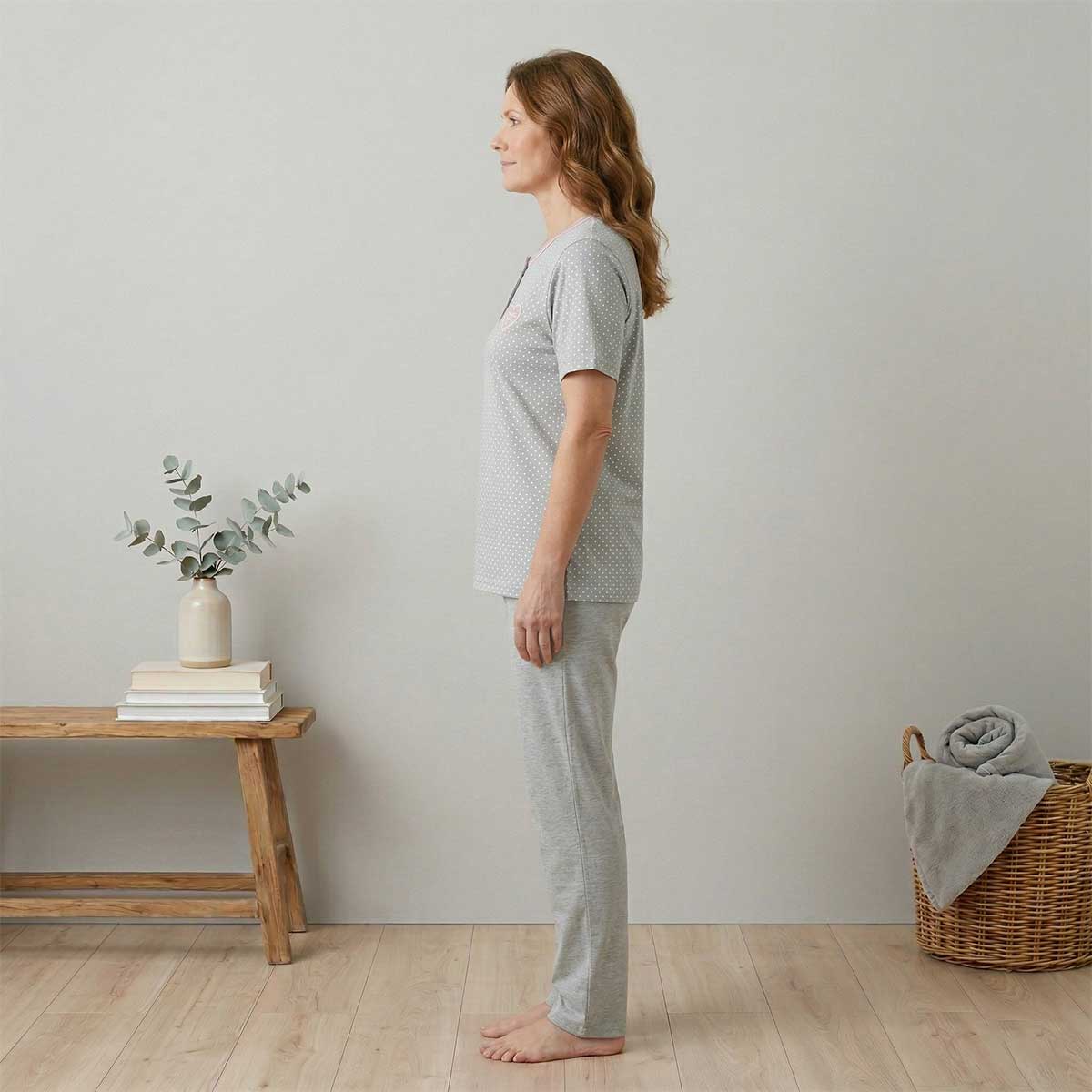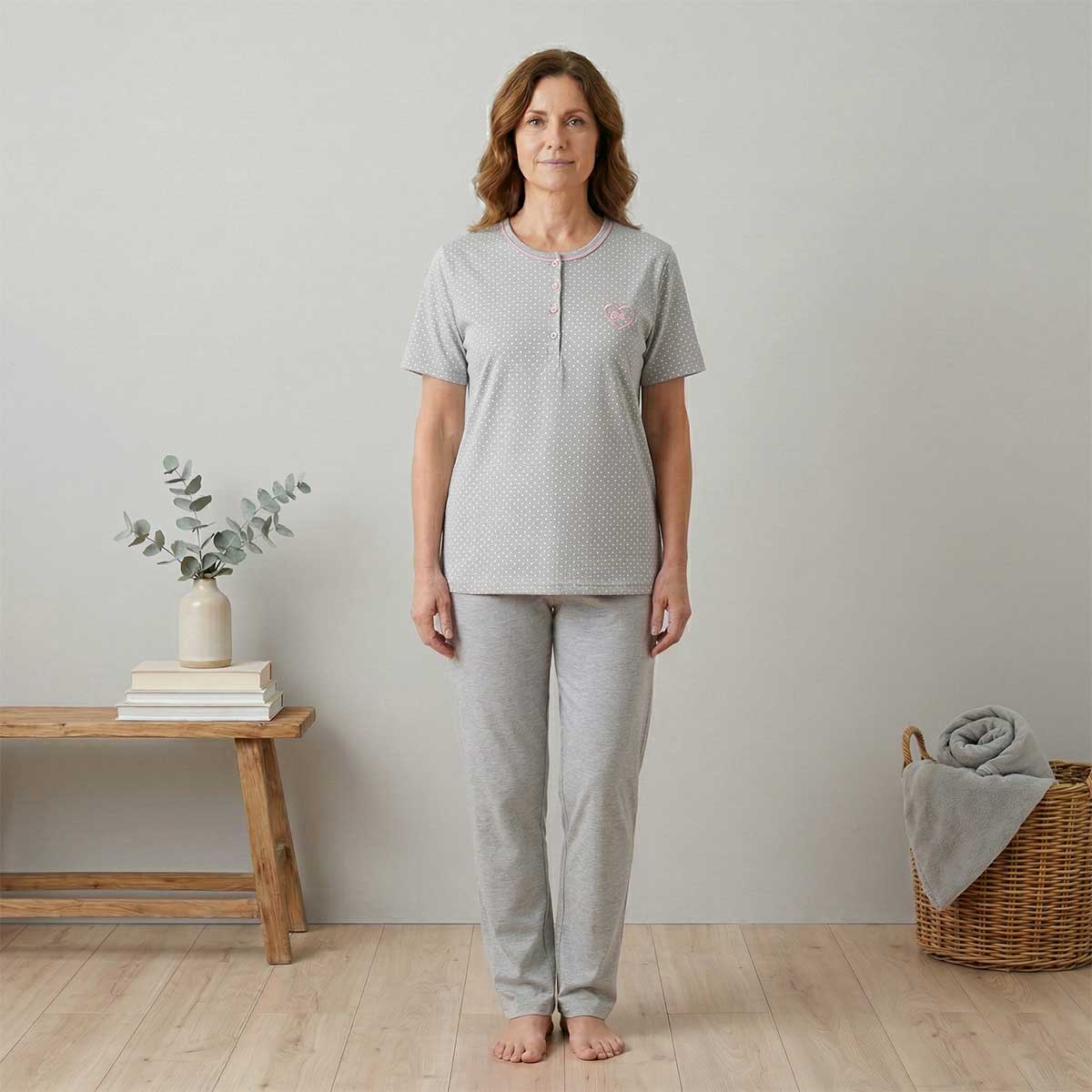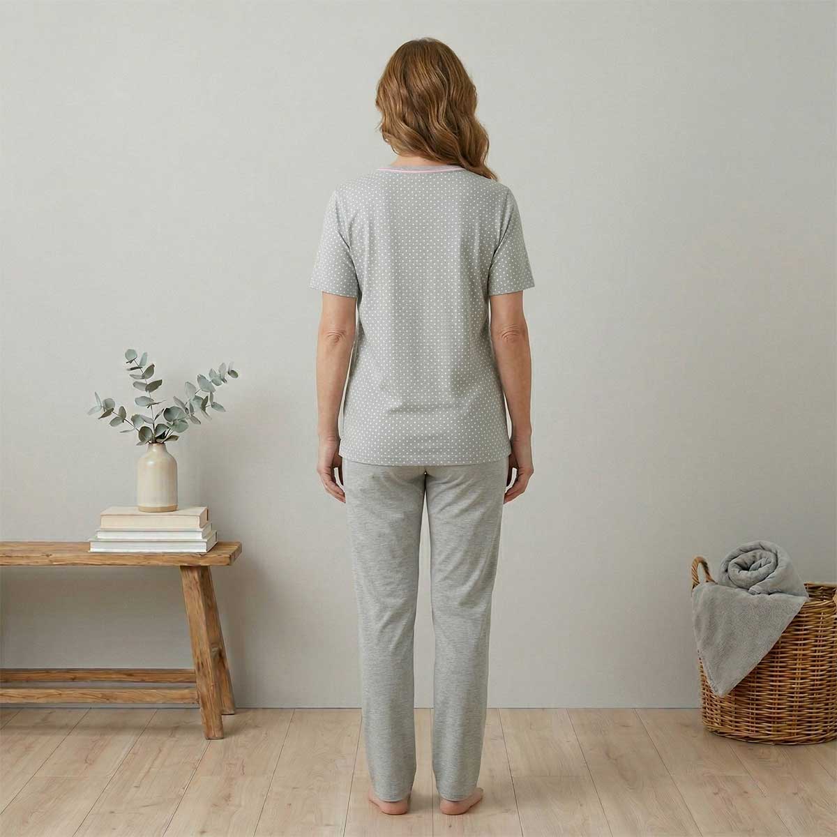 Udobna ženska pižama Minka v elegantni sivi barvi z nežnimi belimi pikicami.