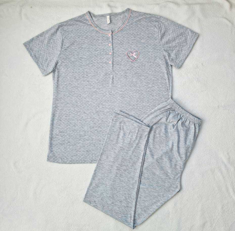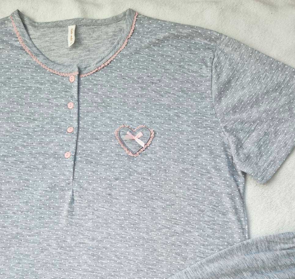 Model: Večji model pižame, zgornji del s kratkimi rokavi in gumbi, dolge hlače. Na voljo v veliksotih od 42 do 48