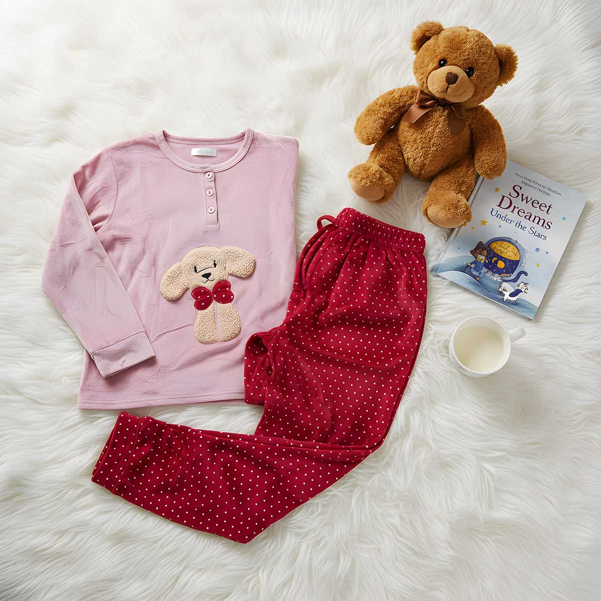 Ta ženska plišasta pižama je popolna izbira za hladne večere, sproščene vikende ali lenobna jutra doma. Izdelana je iz izjemno mehke in tople plišaste tkanine, kar zagotavlja naravno zračnost, raztegljivost in prijeten občutek na koži. Na prsnem delu ima prikupnega kužija.