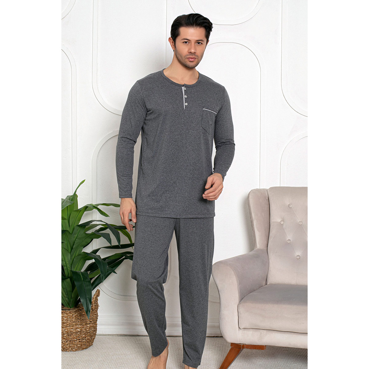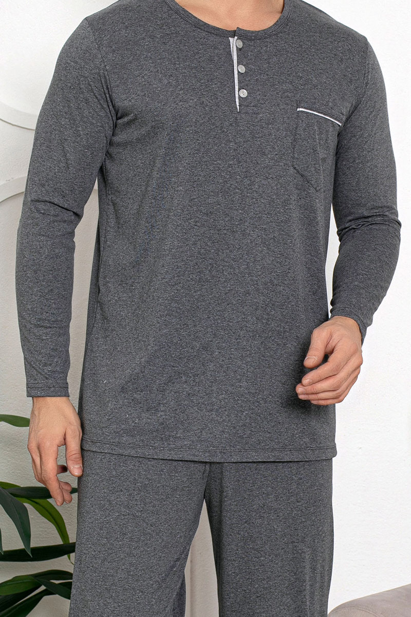Moška pižama iz 100 % bombaža, temno siva z gumbi in temnimi karo hlačami. Udobna, zračna in primerna za sproščene večere. Velikosti 48–54 (M–XXL).