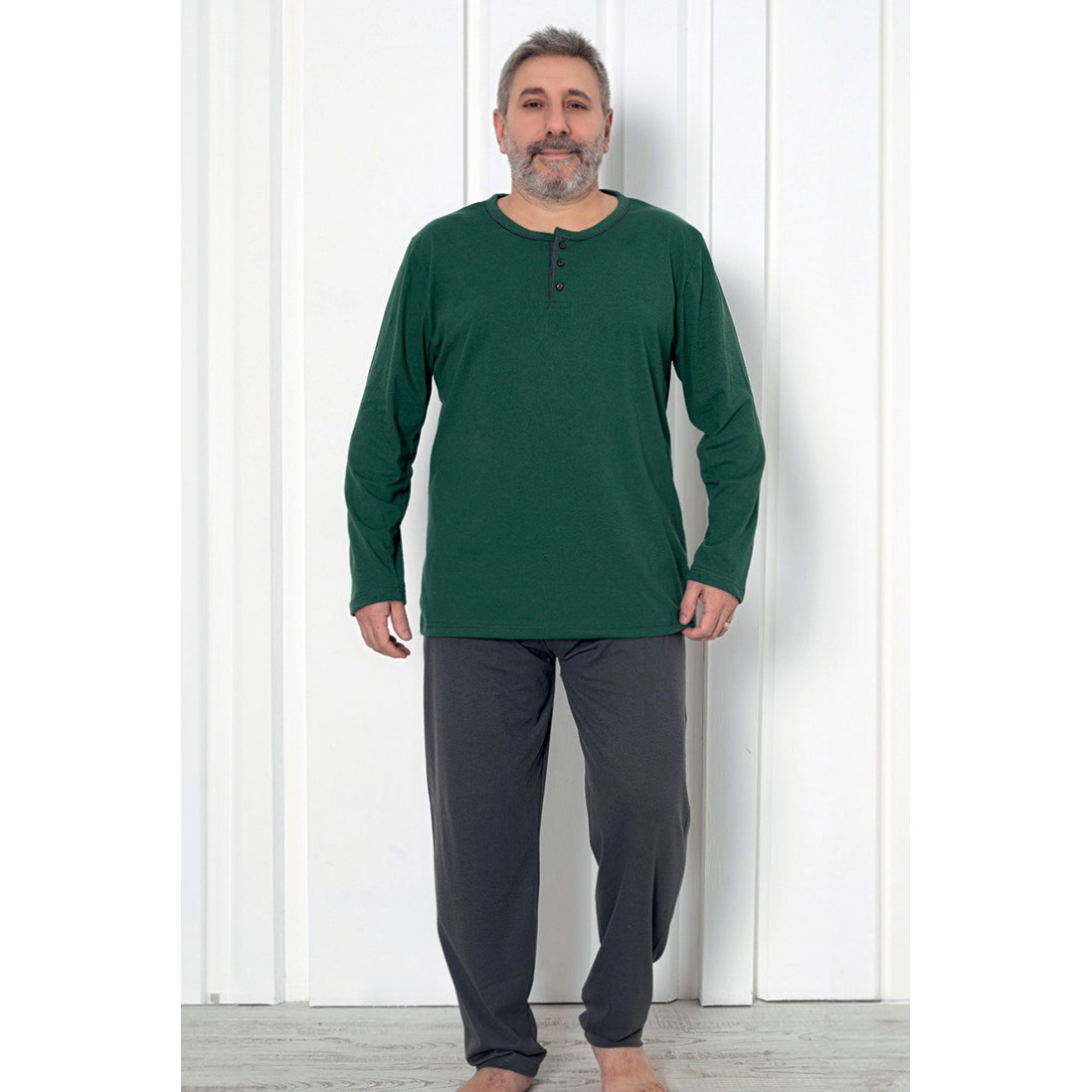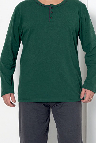 Moška pižama iz 100 % bombaža, zelen zgornji del z gumbi in temno sive hlače. Udobna in zračna. Večji model pižame, velikosti 52–58 (XL–4XL).
