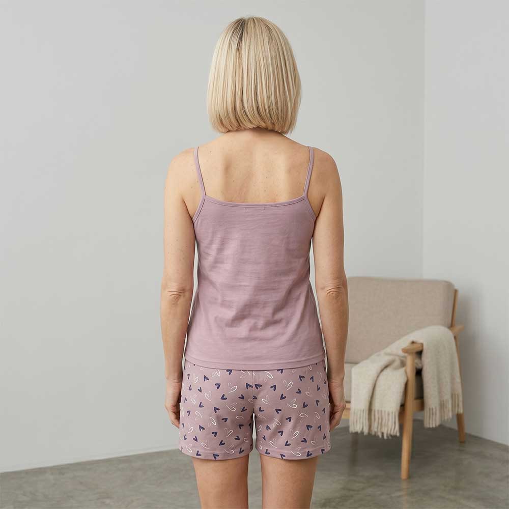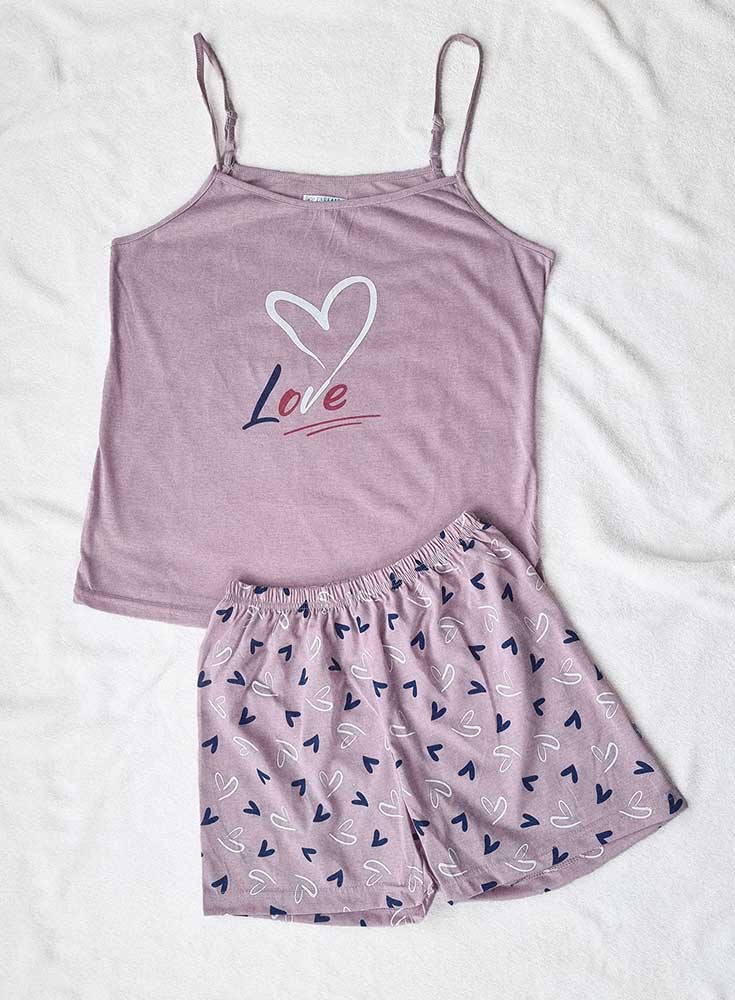 Komplet vključuje majico s tankimi nastavljivimi naramnicami in prikupnim motivom srca ter ujemajoče kratke hlače s potiskom srčkov.