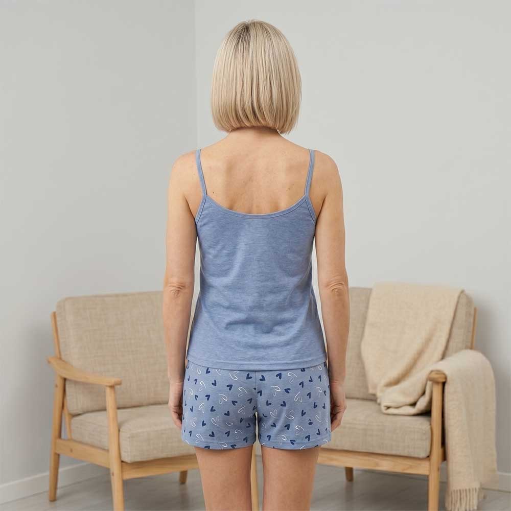 Komplet vključuje majico s tankimi nastavljivimi naramnicami in prikupnim motivom srca ter ujemajoče kratke hlače s potiskom srčkov.