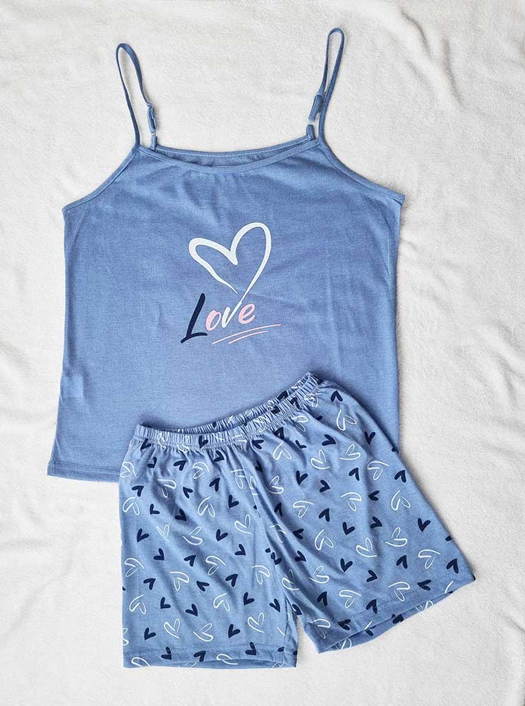 Lahkoten in ženstven kroj: Zgornji del je zasnovan kot majica s tankimi nastavljivimi naramnicami (top), ki nudi maksimalno zračnost in svobodo gibanja. Na prsnem delu se nahaja velik, prefinjen motiv belega srca z napisom “Love”, ki pižami doda nežen in pozitiven pridih.